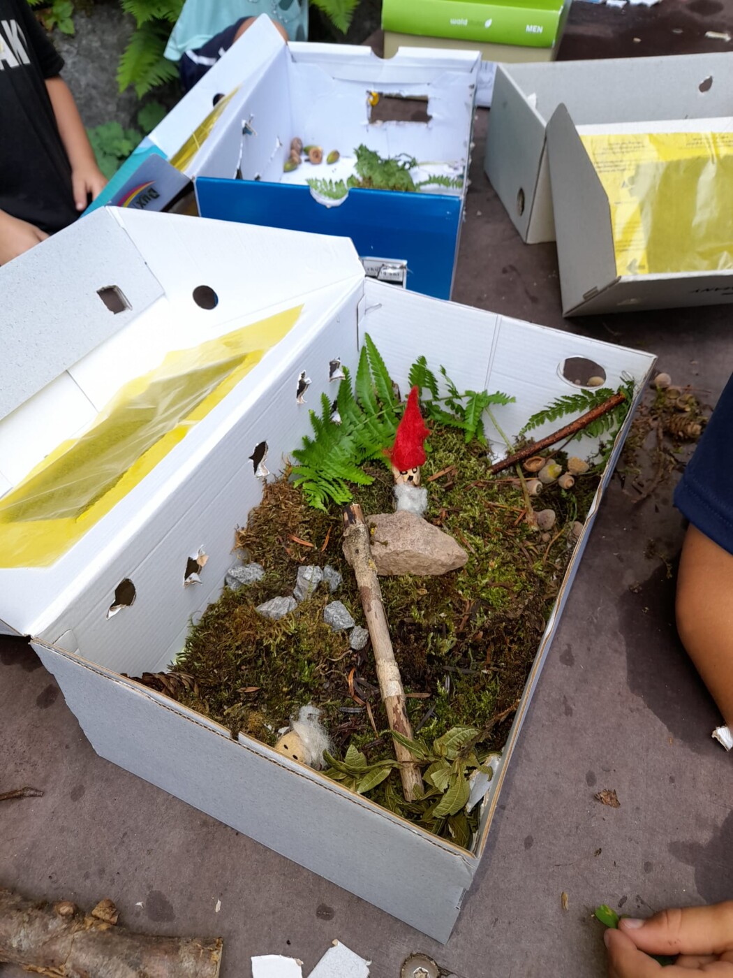 Zur Einstimmung wurde eine Geschichte erzählt, vom „Hörbe“ mit dem großen Hut. Hörte ist ein Hutzelmann. Für ihn und seine Freunde, Feen, Zwerge und Trolle, wurden Wohnungen und Wälder in einem Schuhkarton gebastelt