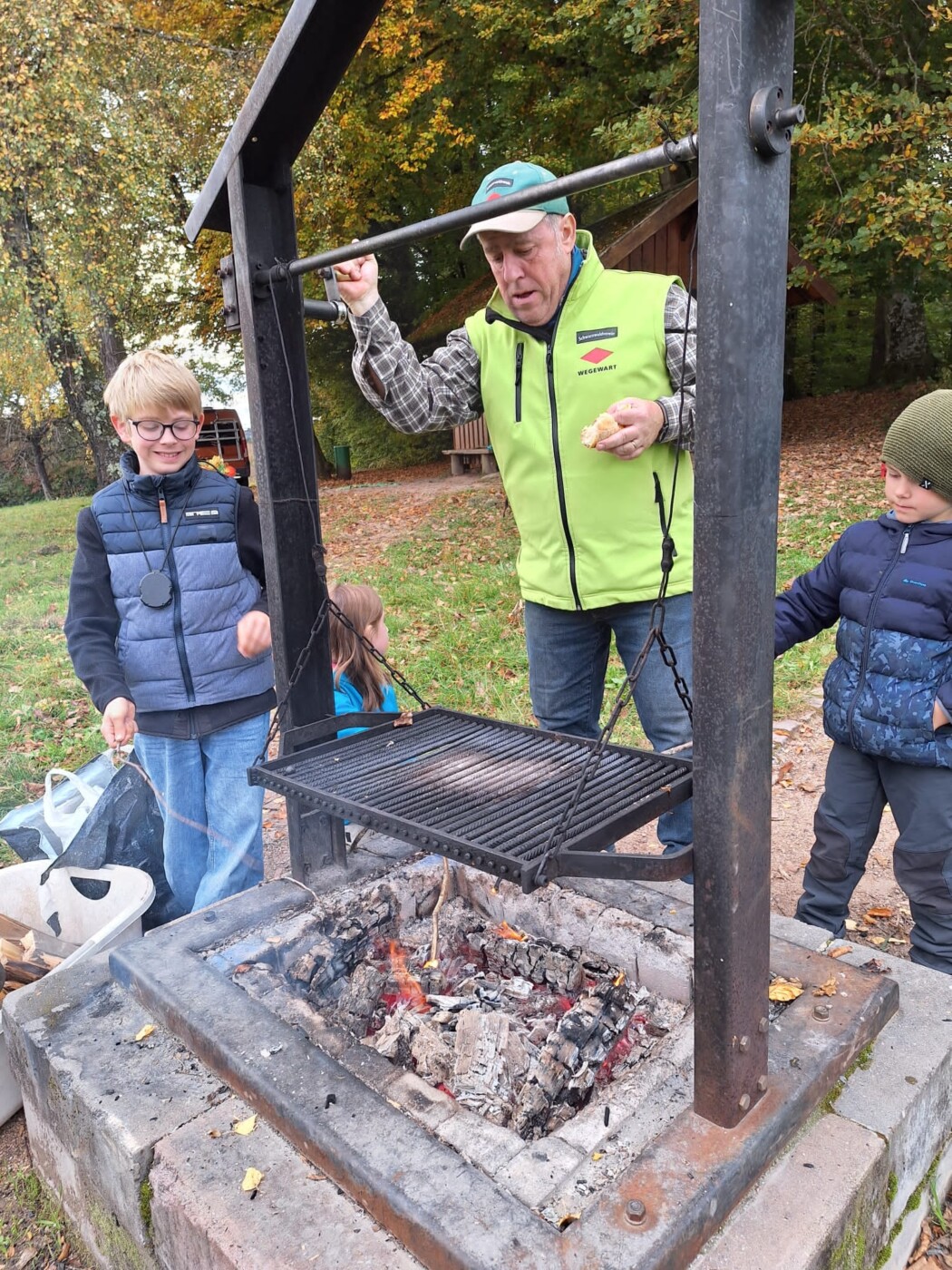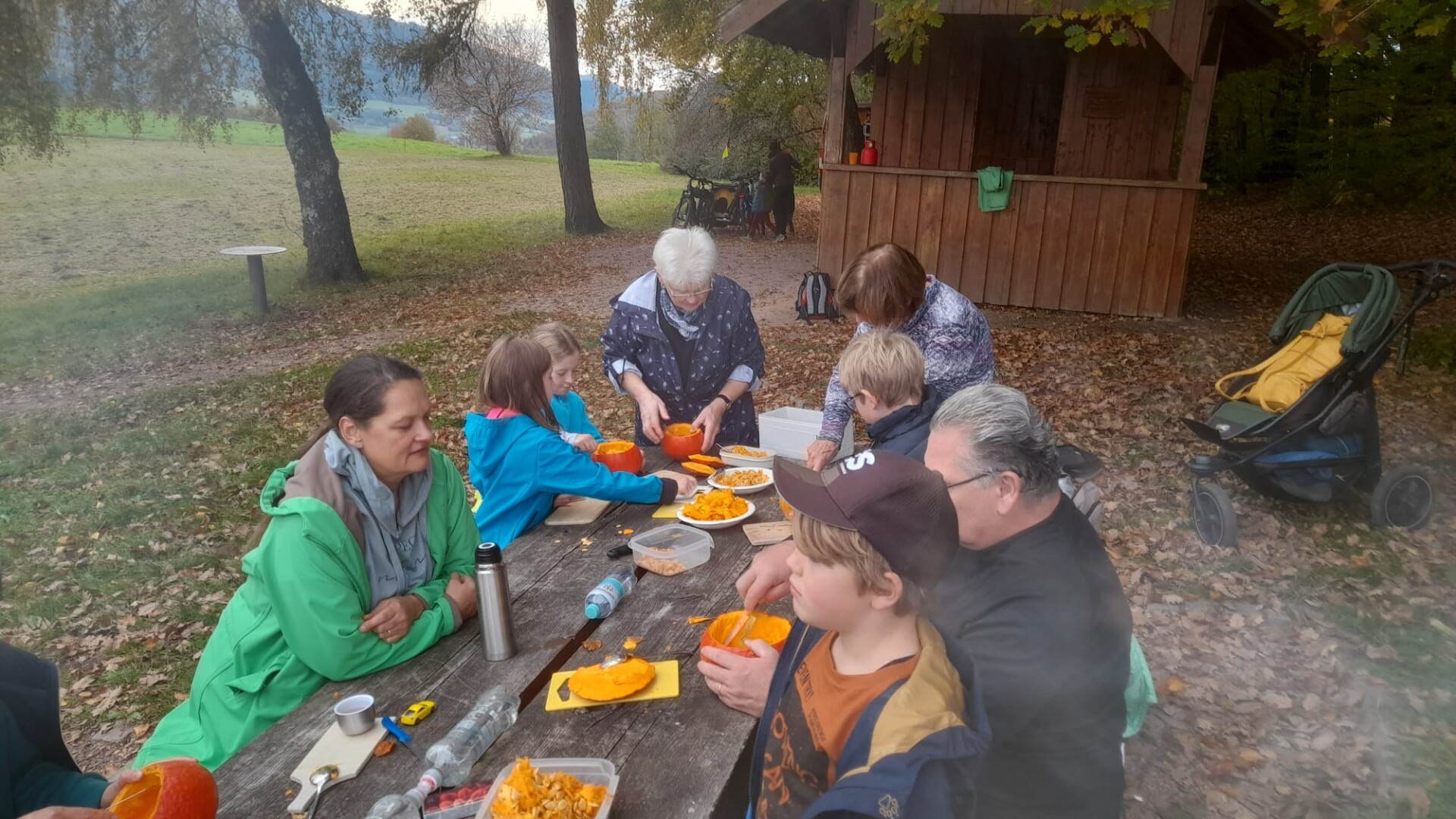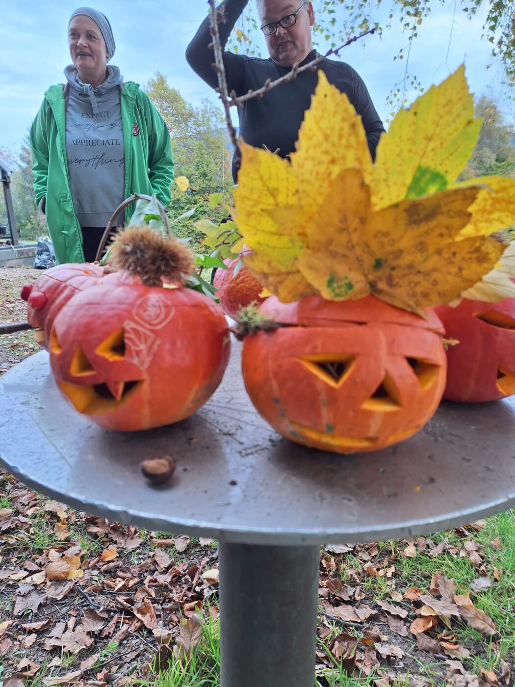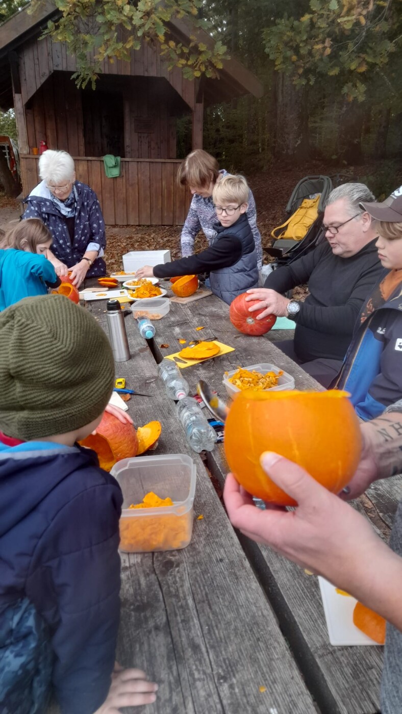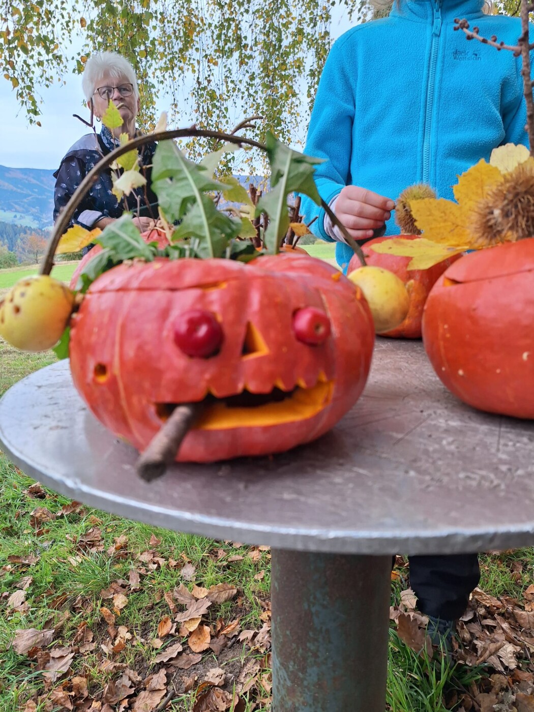 Oben angekommen wurden Kürbisse ausgeholt und geschnitzt und mit den gesammelten Utensilien geschmückt.