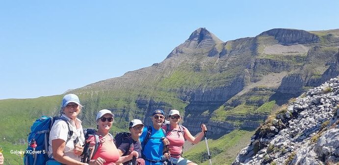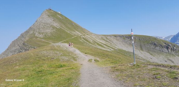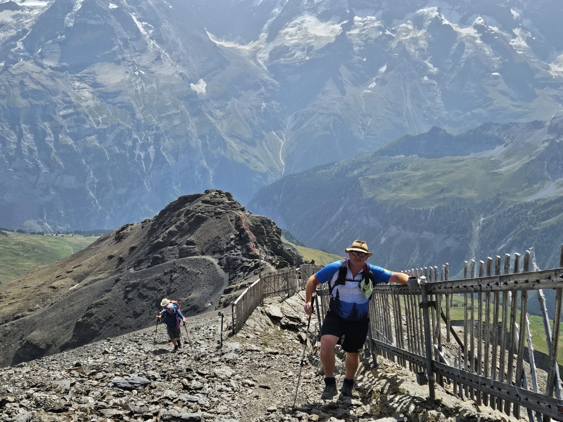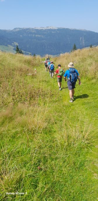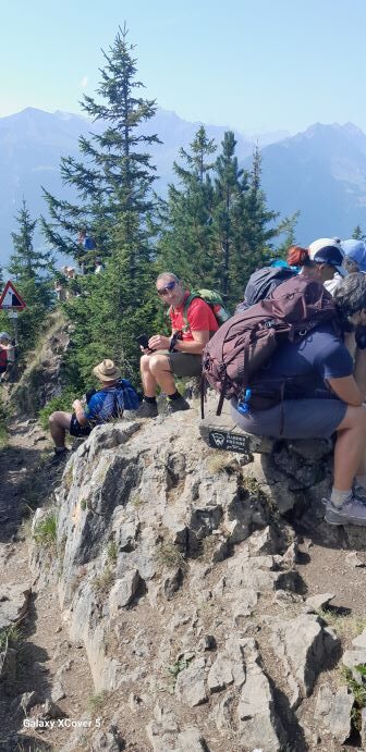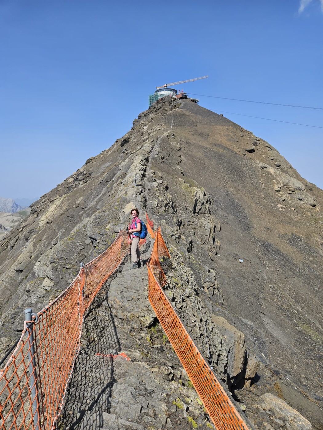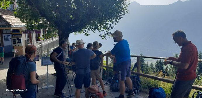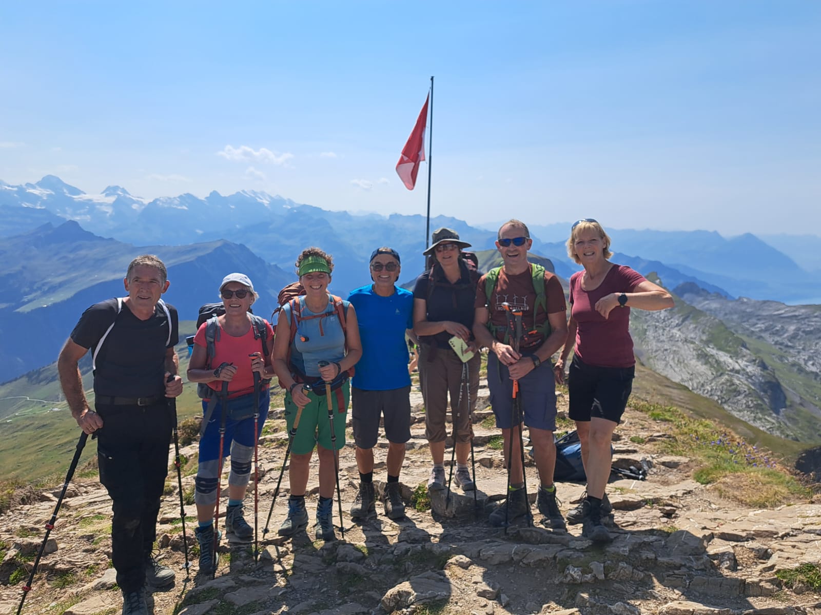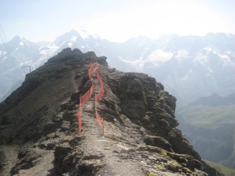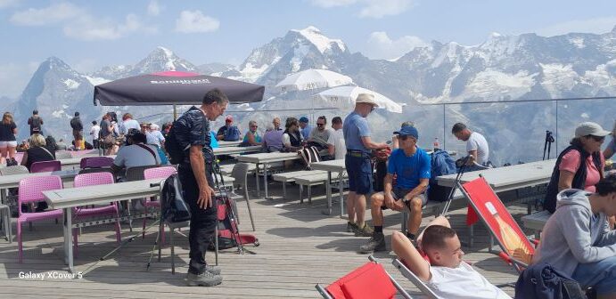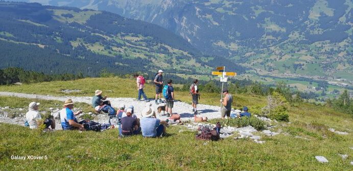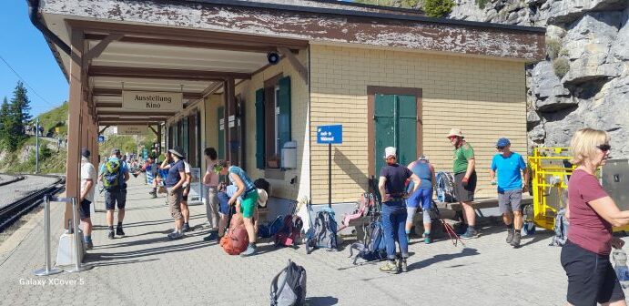 Die dritte Tour startete auf der Zwischenstation Birg der Schilthornbahn auf 2500 m. Nach längerer Anfahrt mit Bahn und Gondel erreichte man das autofreie Dorf Mürren auf 1600 m. Rasch ging es mit der Seilbahn nach oben zur Zwischenstation. Nun erwartete die Teilnehmer ein schweißtreibender und felsdurchsetzter Anstieg auf fast 3000 m. Trittsicherheit und Schwindelfreiheit waren geboten als es über den Schiltgrad steil zum Schilthorn ging. Jubelnd und klatschend wurden alle von den Vorausgegangen empfangen, im besonderen die beiden Teilnehmer die den Weg von Mürren hoch gegangen sind. Auf der Aussichtsplattform zeigte es sich dann das das Schilthorn ein absoluter Hotspot ist. Trotz großer Menschenmassen genoß man die geniale Rundumsicht auf alle Berge und bei sehr guter Weitsicht hätte man den Feldberg erblicken können.