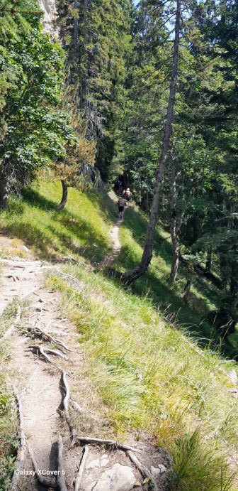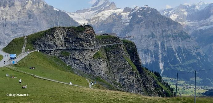 Die zweite und längste Tour am Folgetag führte die Teilnehmer zum Faulhorn(2700 m) und zur First Gondelstation. Nach reichhaltigem Frühstück auf der Terasse der JH mit Blick zum Eiger, Mönch und Jungfrau ging es mit der Bahn nach Wilderswil und mit der alten Zahnradbahn hinauf zur Schynige Platte auf 2000 m. Bei schon sehr warmen Temparaturen wanderte man auf herrlichen und abwechslungsreichen Pfaden dem aussichtsreichen Faulhorn entgegen. Nach steilem Anstieg genoss man die Aussicht zum Thuner- und Brienzersee und die umliegende Bergwelt des Berner Oberlandes einschließlich den Eiger mit Mönch und Jungfrau. Steil abwärts erreichte man am späten Nachmittag den Bachalpsee und nach 16 km Weglänge und 700 Hm im Auf und Ab die Gondelstation. Bevor entgültig nach Grindelwald hinuntergegondelt wurde, ließen sich die Teilnehmer den Weg auf dem in den Felsen geschlagenen Cliff Walk nicht entgehen.