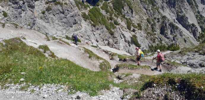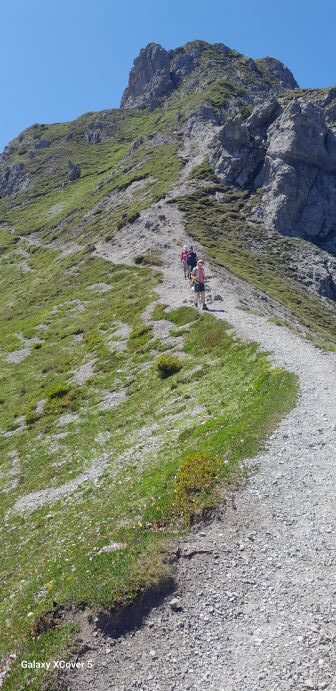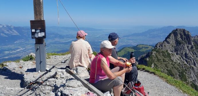 Am nächsten Tag wagten sich vier Teilnehmer/innen zu einer alpinen Tour über den Fürstensteig hinauf zum Kuehgrat (2120 m). Über die Gafadura Hütte mit Einkehr ging es wieder mit Bus zurück nach Triesenberg. Fantastische Weitblicke ins Rheintal, zum Säntis und Bodensee und hinüber in die Montafoner Bergwelt waren der Mühen wert. Die andere Gruppe wanderte über den aussichtsreichen Walser- und Philosophenweg oberhalb des Ortes. Am folgenden Tag ging es wieder gemeinsam auf einfachen Wegen und Pfade ins Valünatal. Herrliche Fauna und Flora entlang des Weges führten zu Gesprächen welchen Namen jene Pflanze oder Blume trägt. Abgerundet wurde die Tour mit einer Einkehr in der Valünaalpe. Am vierten Tag ging es mit Bus zum erstenmal in den Malbuner Talkessel auf 1600 m Höhe. Auf bequemen Weg ging es hinauf zur Sareiser Bergstation und über den Grat zum Sareiser Joch (1990 m). Nach ausgiebigen Weitblicken ging es wieder auf alpine Pfade hinunter zum Malbuner Panoramaweg  mit Einkehr in der Alpe Pradameer. Begleitet durch einen kurzen Regenschauer stieg man ab nach Malbun. Am letzten Tag stand nocheinmal eine alpine Tour auf dem Programm. Von Malbun ging es auf Pfaden über die Tällihöhi und Gritschalm zur Pfälzer Hütte (2120 m). Nach einer Rast stieg ein Teil der Gruppe über die Gritschalm und Pfad hinunter zur Valünaalpe und weiter talauswärts nach Steg. Der andere Teil der Gruppe stieg über teilweise steiles und verblocktes Gelände hinauf zum Augstenberg (2360 m). Grandioser Rundumblick ließen die Mühen vergessen und über den Gratweg zum Sareiser Joch ging es steil hinunter nach Malbun. Nach über 70 Wanderkilometern und insgesamt 3300 Höhenmetern hieß es am darauffolgenden Tag Abschied nehmen aus der tollen Unterkunft mit dem täglichen Ausblick ins Rheintal beim Frühstück und Abendessen und deren Sonnenuntergänge.